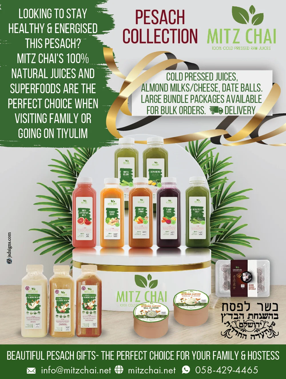 Going on a Tiyul? Visiting with family or friends? Make sure to have enough Mitz Chai for everyone to enjoy to stay strong, healthy and “regular” over the Holiday! We have a limited Pesach Collection and want to HELP you Nourish your family with our fresh, Bedatz Kosher-for-Pesach Cold Pressed Juices, Almond milks, Almond Cheese and our world famous Almond Date Balls! If you place your Pesach Bundle order by April 3 get a FREE Picnick insulated Pic Nic Basket!!!